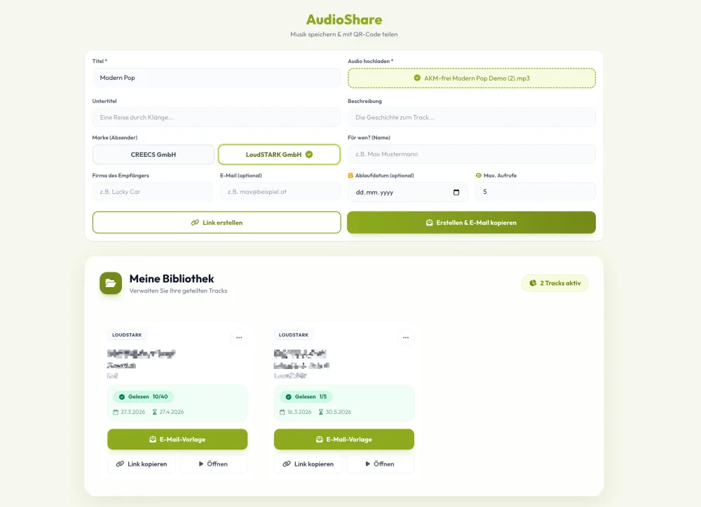 Internal tool to share audio previews with clients. QR-code deep links, per-client branded themes, and a MySQL-backed view counter with per-link access limits.