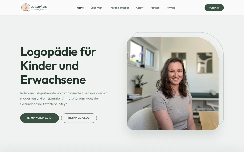 Practice site for a speech therapist. Online booking via Netlify forms, JSON-LD medical business schema, local SEO targeting Upper Austria, and a mobile Core Web Vitals pass.
